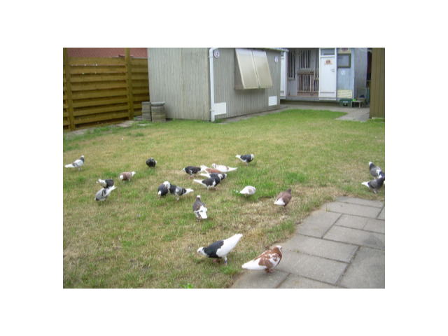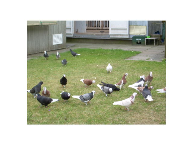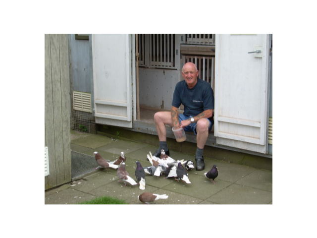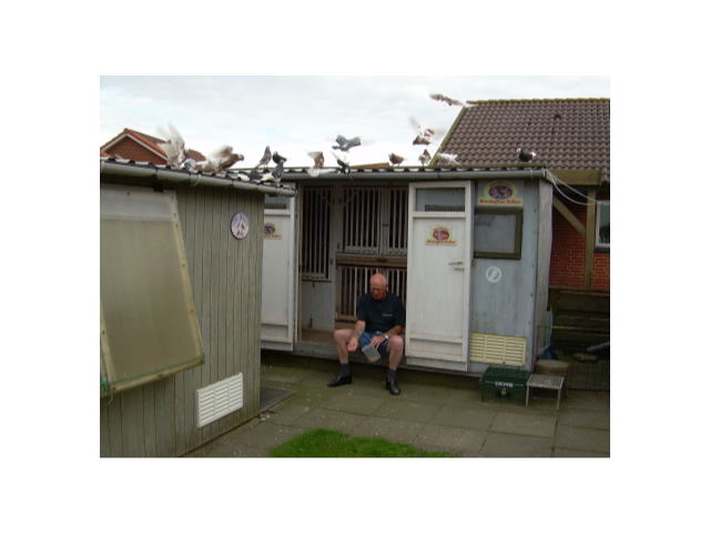 Eric in front of flying loft | Getting the birds down | Old birds | 2009 yearlings |