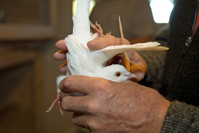 Back inside the loft Cheney asked to handle the birds. His calloused hands gently cupped a hen with lifetime of familiarity. He manipulated the bird demonstrating her extremely flexible conformation, bending her tail feathers over her back to touch her head and rolling her into a feather ball. He explained how this level of flexibility shows excellent flying and maneuvering potential. Schoening looked pleased with the high praise proffered from a master not easily impressed.