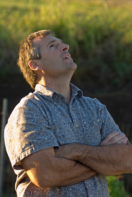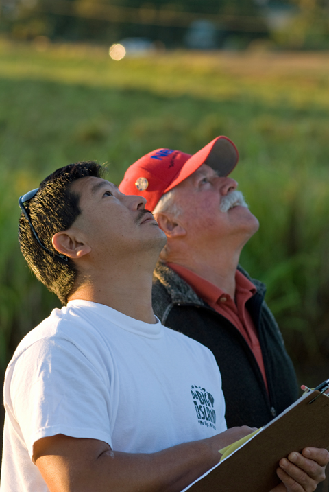 On the other side of the yard Schoening paced, glancing upward from time to time at his kit on the wing. He explained, "The oldest bird up there is just nine months old, they're young, they're teenagers, they act like teenagers... They don't always do what they're supposed to." As Cheney and Aoki stood with their heads tilted back and their eyes trained on the kit, Schoening explained how he moved to the Big Island a year ago and doesn't have a good gauge on the temperature, still expecting it to be cooler at night, and the miscalculation is showing in the behavior of the birds. The training regimen is critical to the performance of the kit. The birds need to be in top shape, but a bit on the edge, not so strong as to dampen the trigger reflex that cause them to roll. Diet is a big factor. Schoening starts about ten days prior to competition with a low protein high carbohydrate diet of milo grain, then reduces the ration of milo and introduces peas, which are high in protein for two days. Then he switches to high fat millet for the last twelve hours before competition. "But it works better on older birds....figures, trying to manage teenagers" he added.