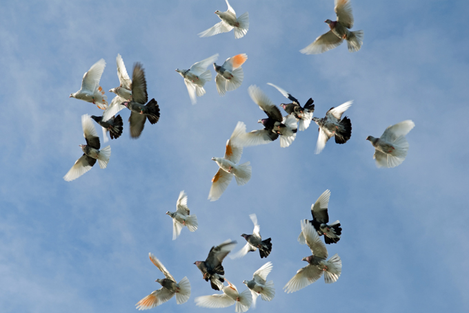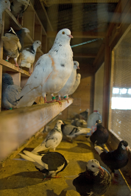 Birmingham Roller Pigeons are distant relatives of the rock dove. They traveled west from the Middle East during the Crusades along with their nemesis, the falcons. Falconry became a pastime of the royalty, and the peasants ended up with the pigeons. The birds have been bred over the past one thousand years for the ability to break in midflight and roll backwards in tight rotations of reverse somersaults before resuming flight. They execute these acrobatic manuevers as a synchronized group. Roller pigeons in competitions are judged on several factors; the number of birds in the kit that roll simultaneously, the distance, or depth, that they fall while they're rolling, as well as the quality of the roll.