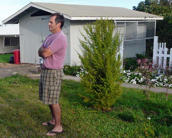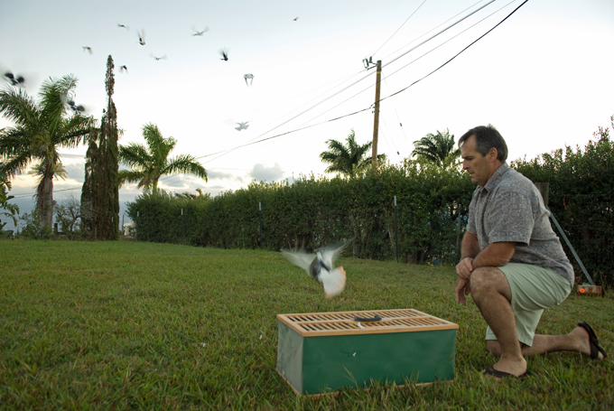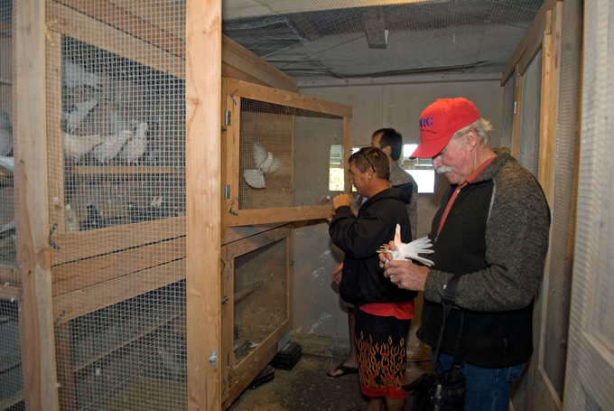 Schoening, with a cup of coffee in his hand, motioned toward the padlocked doors on the old plantation house garage that now serves as the home for his birds, "I don't want to open the loft until we're ready to go," he said in the understated tone which steady hands use. Schoening had qualified for the National 2008 Fall Fly Competition by scoring the highest in the Hawaii Regional Championships several months earlier with his kit of 20 Birmingham Roller Pigeons. These birds were hand-picked from the family of English pigeons that Schoening has been breeding since 1983.