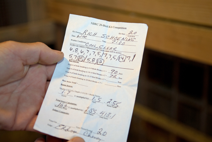 Both Schoening and Cheney have been involved with the pigeons since they were about five years old. Schoening's breeding line is matrilineal, hen lines, he calls them, although both men noted that Schoening had an outstanding cock-bird in flight. With no fanfare, after the 20 minute judgment period ended, Aoki called the time and the competition was over. Cheney took the notepad, pulled a calculator out of his pocket, and retired to the front step while Schoening and Aoki continued to watch the Rollers circle over the house dropping as much as 30 feet all together from time to time.